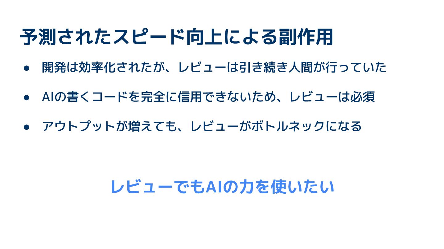 予測されたスピード向上による副作用 • 開発は効率化されたが、レビューは引き続き人間が行っていた • AIの書くコードを完全に信用できないため、レビューは必須 • アウトプットが増えても、レビューがボトルネックになる レビューでもAIの力を使いたい