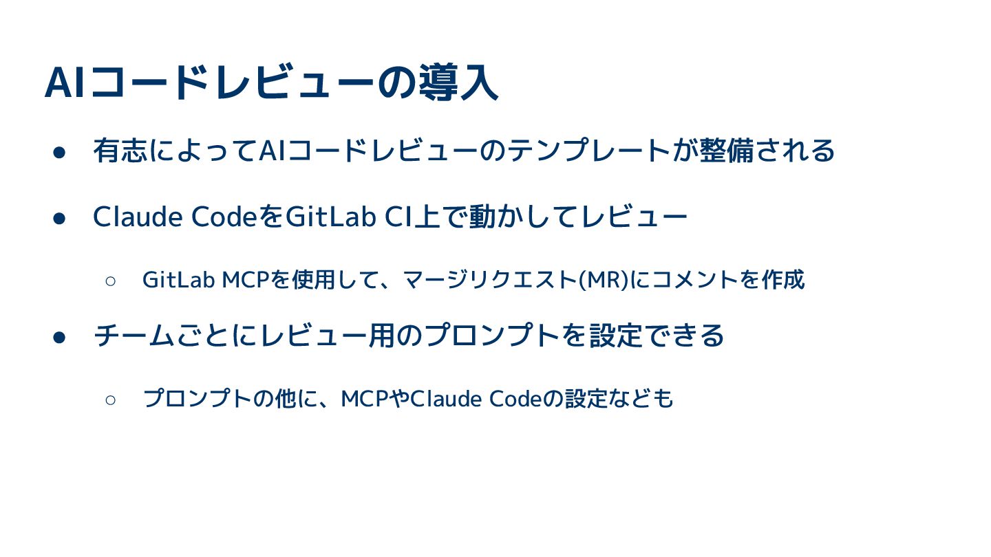 AIコードレビューの導入 • 有志によってAIコードレビューのテンプレートが整備される • Claude CodeをGitLab CI上で動かしてレビュー ◦ GitLab MCPを使用して、マージリクエスト(MR)にコメントを作成