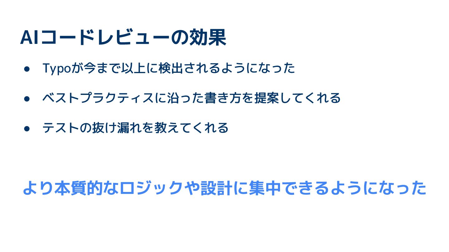 AIコードレビューの効果 • Typoが今まで以上に検出されるようになった • ベストプラクティスに沿った書き方を提案してくれる • テストの抜け漏れを教えてくれる より本質的なロジックや設計に集中できるようになった