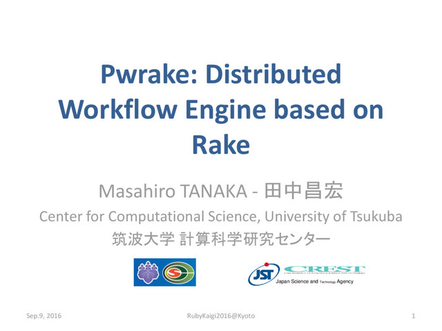 by local storage of compute nodes. ▶ Designed for wide-area file sharing ◦ across institutes connected through the Internet. ▶ Open-Source project by Prof. Tatebe ◦ Since 2000. ◦ Gfarm ver. 2 since 2007. ◦ Current version: version 2.6.12 ▶ Reference: ◦ Osamu Tatebe, Kohei Hiraga, Noriyuki Soda, "Gfarm Grid File System", New Generation Computing, 2010, Vol.28, issue 3, p.257 Sep.9, 2016 RubyKaigi2016@Kyoto 30