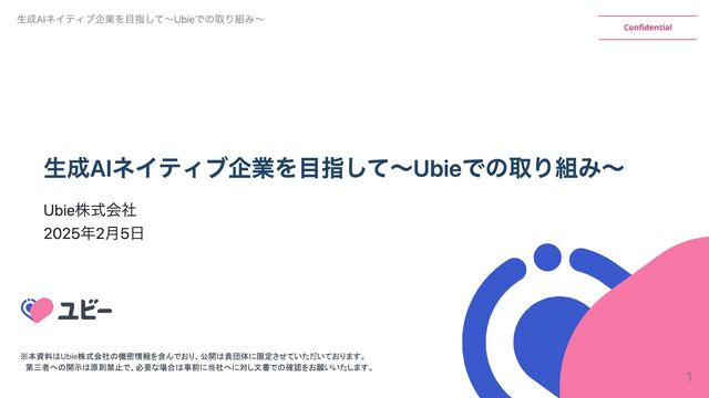 生成AIネイティブ企業を目指して〜Ubieでの取り組み〜 Ubie株式会社 2025年2月5日 生成AIネイティブ企業を目指して〜Ubieでの取り組み〜 1