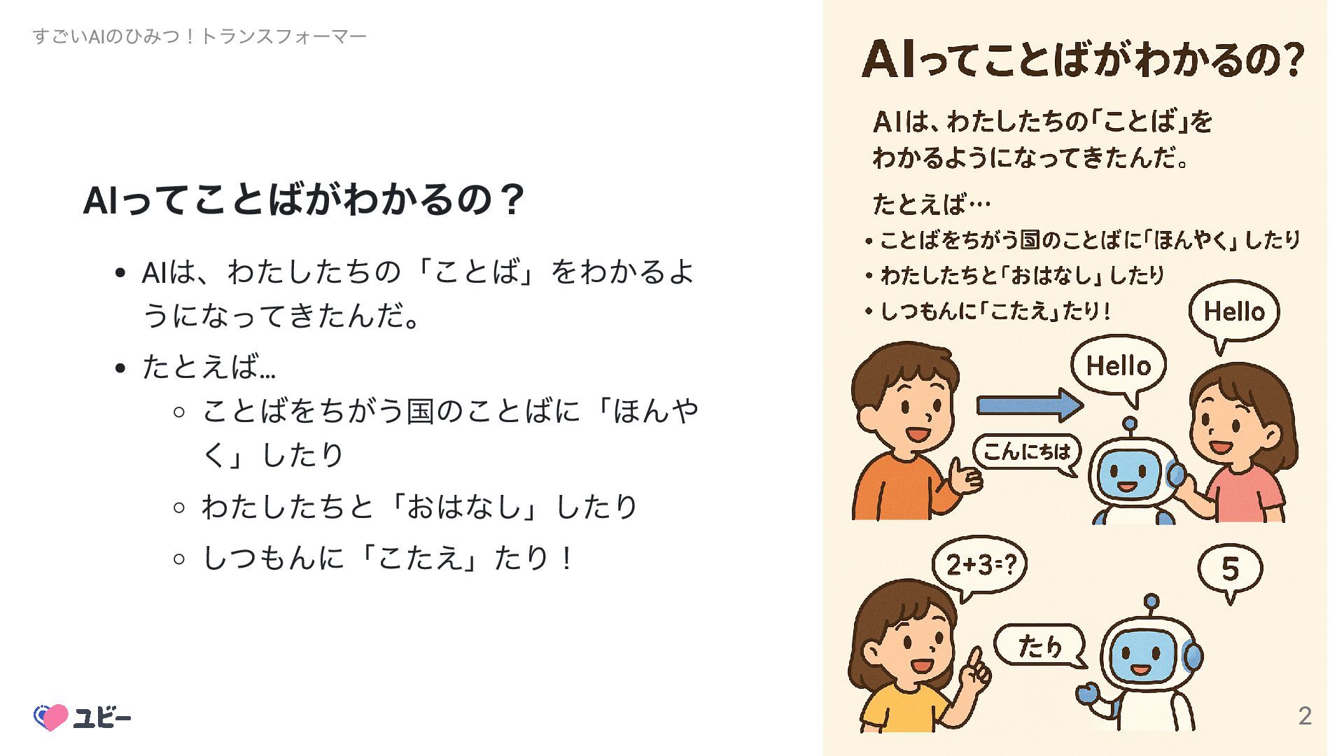 AIってことばがわかるの? AIは、わたしたちの「ことば」をわかるよ うになってきたんだ。 たとえば… ことばをちがう国のことばに「ほんや く」したり わたしたちと「おはなし」したり しつもんに「こたえ」たり! すごいAIのひみつ!トランスフォーマー 2