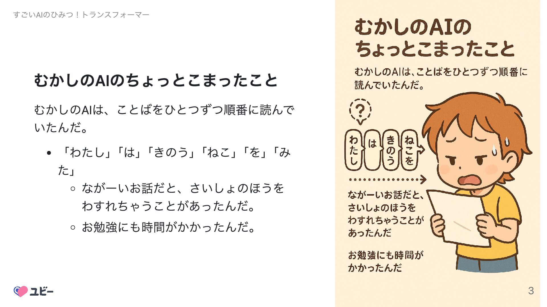 ながーいお話だと、さいしょのほうを わすれちゃうことがあったんだ。 お勉強にも時間がかかったんだ。 すごいAIのひみつ!トランスフォーマー 3