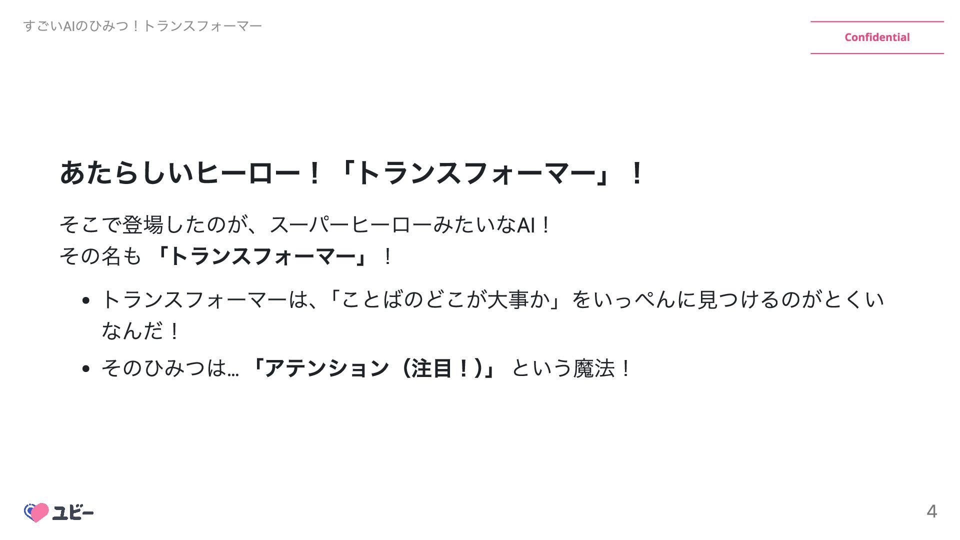 あたらしいヒーロー!「トランスフォーマー」! そこで登場したのが、スーパーヒーローみたいなAI! その名も 「トランスフォーマー」! トランスフォーマーは、 「ことばのどこが大事か」をいっぺんに見つけるのがとくい なんだ! そのひみつは… 「アテンション(注目!) 」