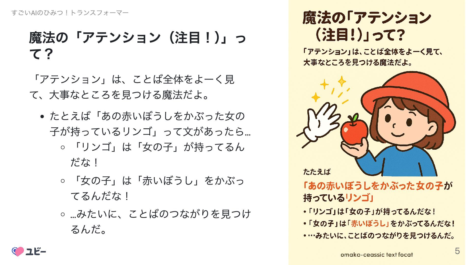 魔法の「アテンション(注目!) 」っ て? 「アテンション」は、ことば全体をよーく見 て、大事なところを見つける魔法だよ。 たとえば「あの赤いぼうしをかぶった女の 子が持っているリンゴ」って文があったら… 「リンゴ」は「女の子」が持ってるん だな! 「女の子」は「赤いぼうし」をかぶっ