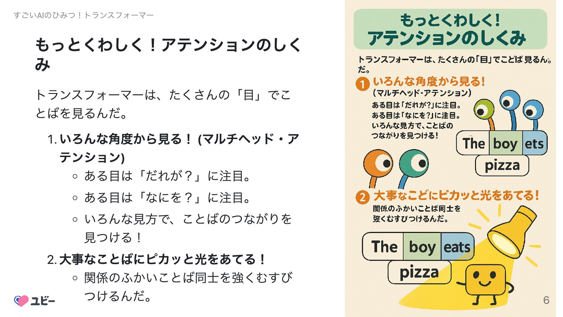 いろんな見方で、ことばのつながりを 見つける! 2. 大事なことばにピカッと光をあてる! 関係のふかいことば同士を強くむすび つけるんだ。 すごいAIのひみつ!トランスフォーマー 6