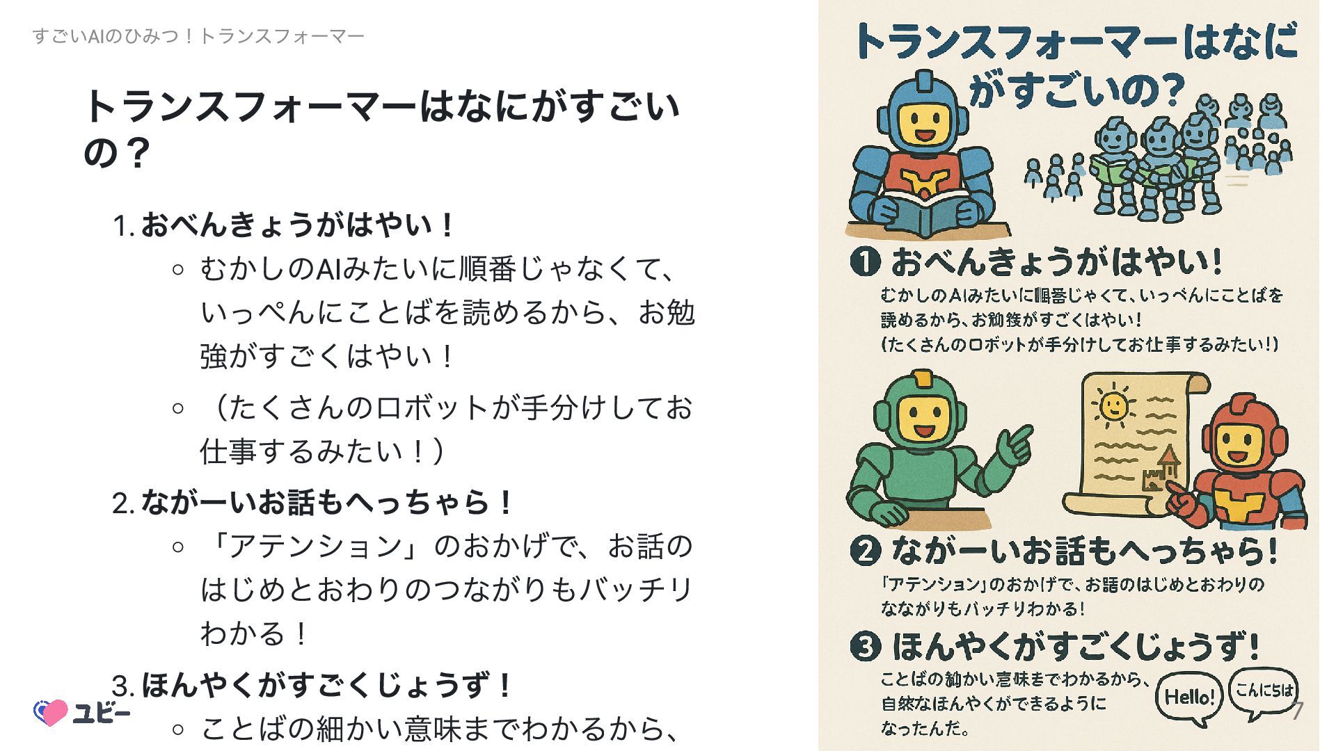 トランスフォーマーはなにがすごい の? 1. おべんきょうがはやい! むかしのAIみたいに順番じゃなくて、 いっぺんにことばを読めるから、お勉 強がすごくはやい! (たくさんのロボットが手分けしてお 仕事するみたい!) 2.