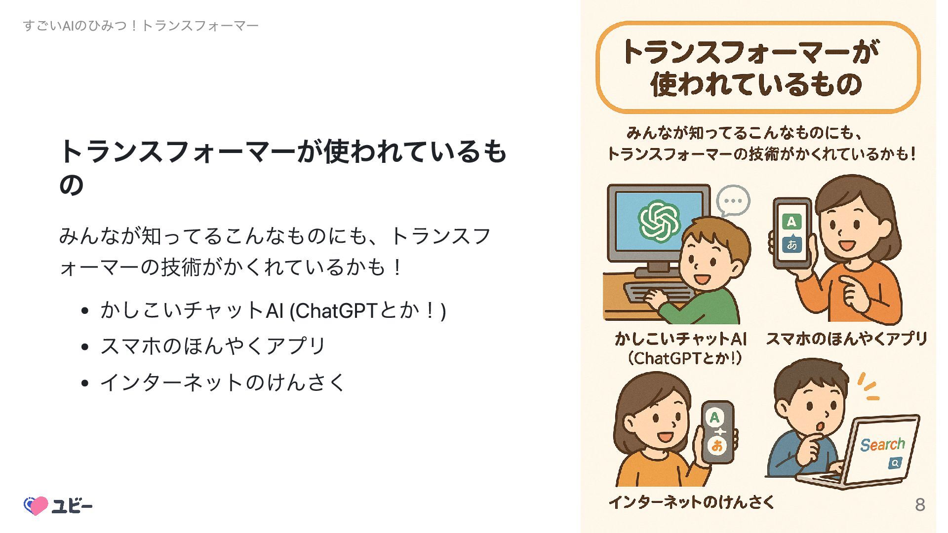 トランスフォーマーが使われているも の みんなが知ってるこんなものにも、トランスフ ォーマーの技術がかくれているかも! かしこいチャットAI (ChatGPTとか!) スマホのほんやくアプリ インターネットのけんさく すごいAIのひみつ!トランスフォーマー 8