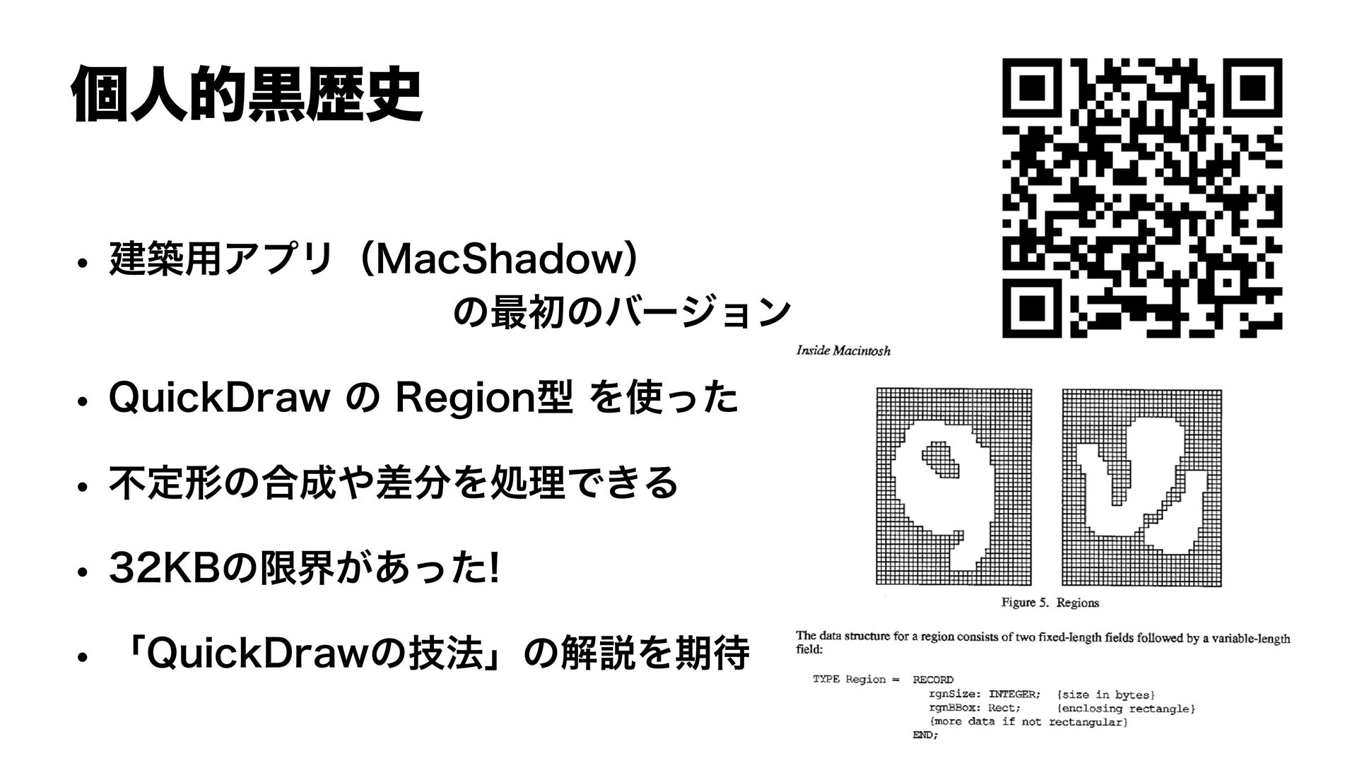ݸਓతࠇྺ࢙ w ݐங༻ΞϓϦʢ.BD4IBEPXʣ ɹɹɹɹɹɹɹɹɹͷ࠷ॳͷόʔδϣϯ w 2VJDL%SBXͷ3FHJPOܕΛͬͨ w ෆఆܗͷ߹ࠩΛॲཧͰ͖Δ w ,#ͷݶք͕͋ͬͨ