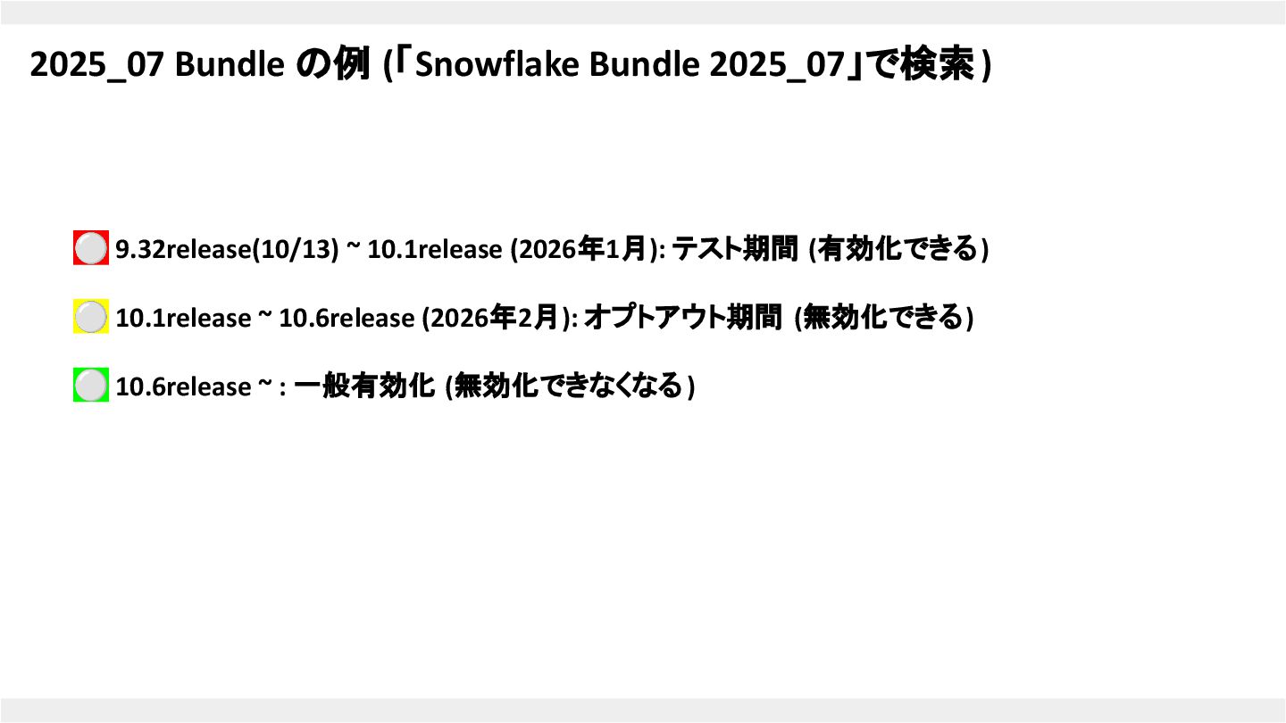 2025_07 Bundle の例 (「Snowflake Bundle 2025_07」で検索) ⚪ 9.32release(10/13) ~ 10.1release