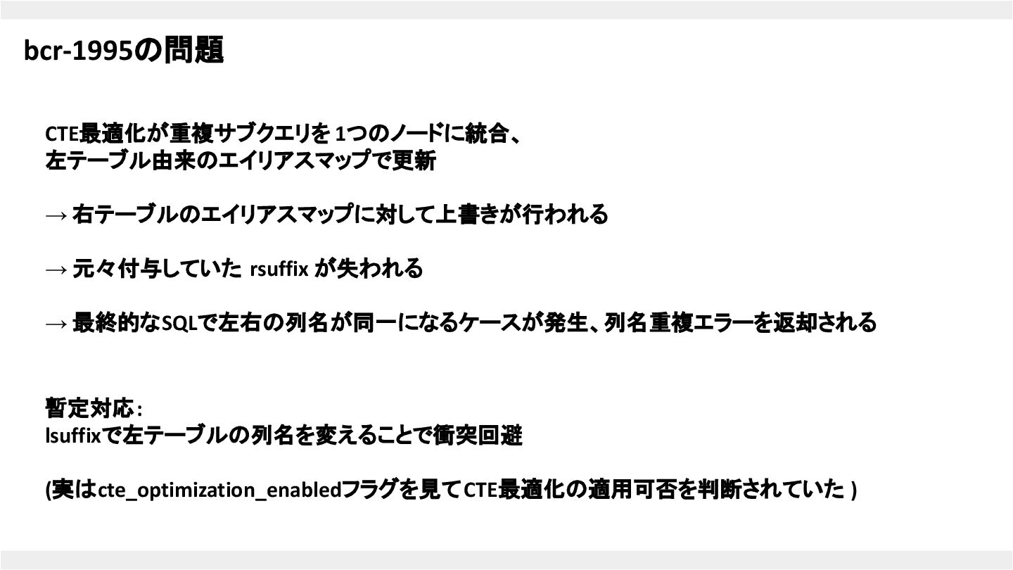 bcr-1995の問題 CTE最適化が重複サブクエリを 1つのノードに統合、 左テーブル由来のエイリアスマップで更新 → 右テーブルのエイリアスマップに対して上書きが行われる → 元々付与していた rsuffix が失われる