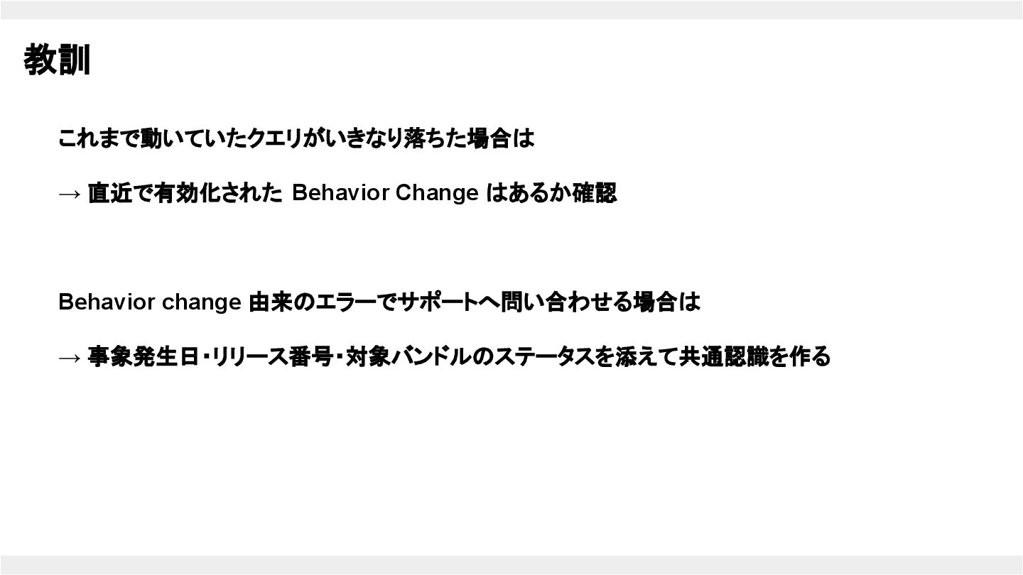 教訓 これまで動いていたクエリがいきなり落ちた場合は → 直近で有効化された Behavior Change はあるか確認 Behavior change 由来のエラーでサポートへ問い合わせる場合は