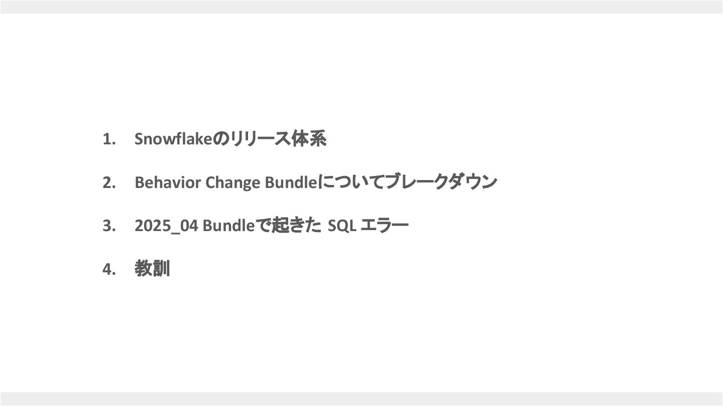 1. Snowflakeのリリース体系 2. Behavior Change Bundleについてブレークダウン 3. 2025_04 Bundleで起きた SQL