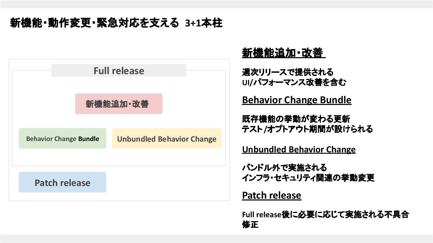 新機能・動作変更・緊急対応を支える 3+1本柱 Full release 新機能追加・改善 Patch release Behavior Change Bundle