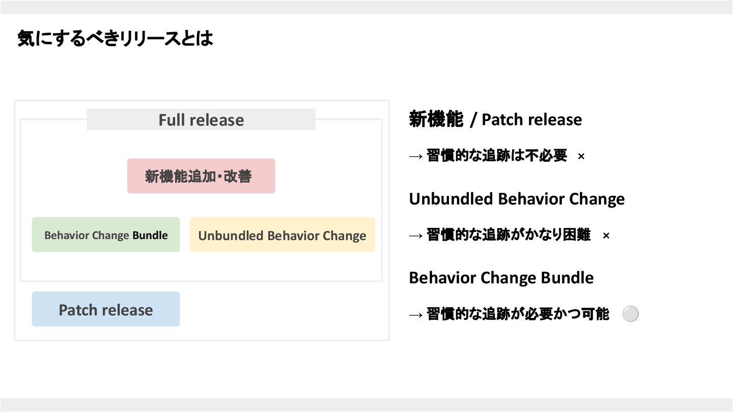 気にするべきリリースとは 新機能 / Patch release → 習慣的な追跡は不必要 × Unbundled Behavior