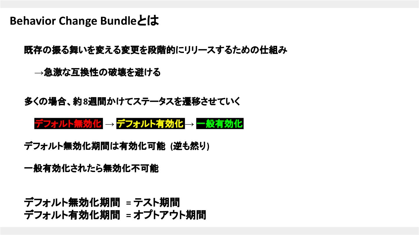 Behavior Change Bundleとは 多くの場合、約8週間かけてステータスを遷移させていく デフォルト無効化 → デフォルト有効化→ 一般有効化 デフォルト無効化期間は有効化可能 (逆も然り)