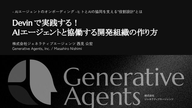 Devin で実践する! AIエージェントと協働する開発組織の作り方 株式会社ジェネラティブエージェンツ 西見 公宏 - AIエージェントのオンボーディング -ヒトとAIの協同を支える"役割設計"とは Generative