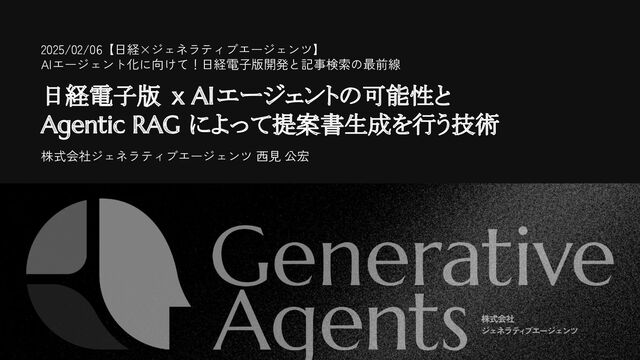 日経電子版 x AIエージェントの可能性と Agentic RAG によって提案書生成を行う技術 株式会社ジェネラティブエージェンツ 西見 公宏 2025/02/06【日経×ジェネラティブエージェンツ】