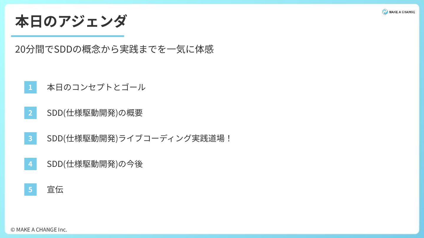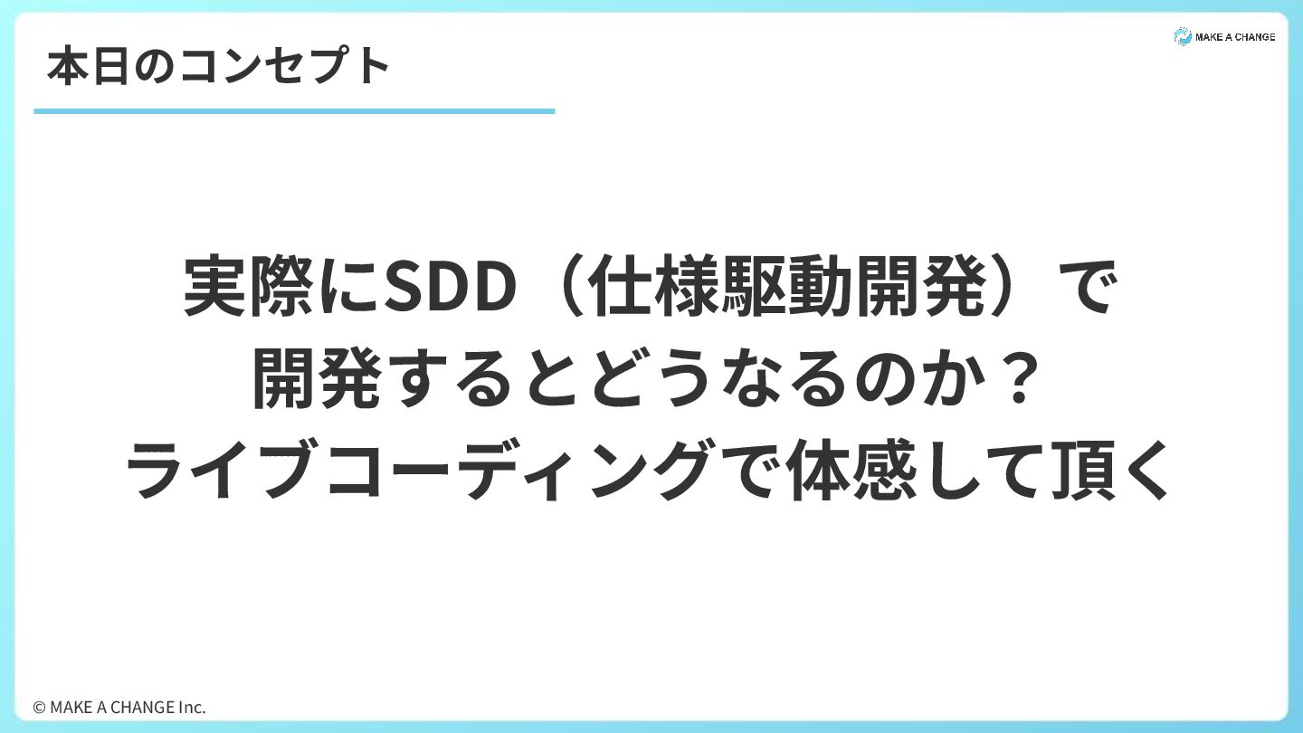 本⽇のコンセプト 実際にSDD(仕様駆動開発)で 開発するとどうなるのか? ライブコーディングで体感して頂く © MAKE A CHANGE Inc.