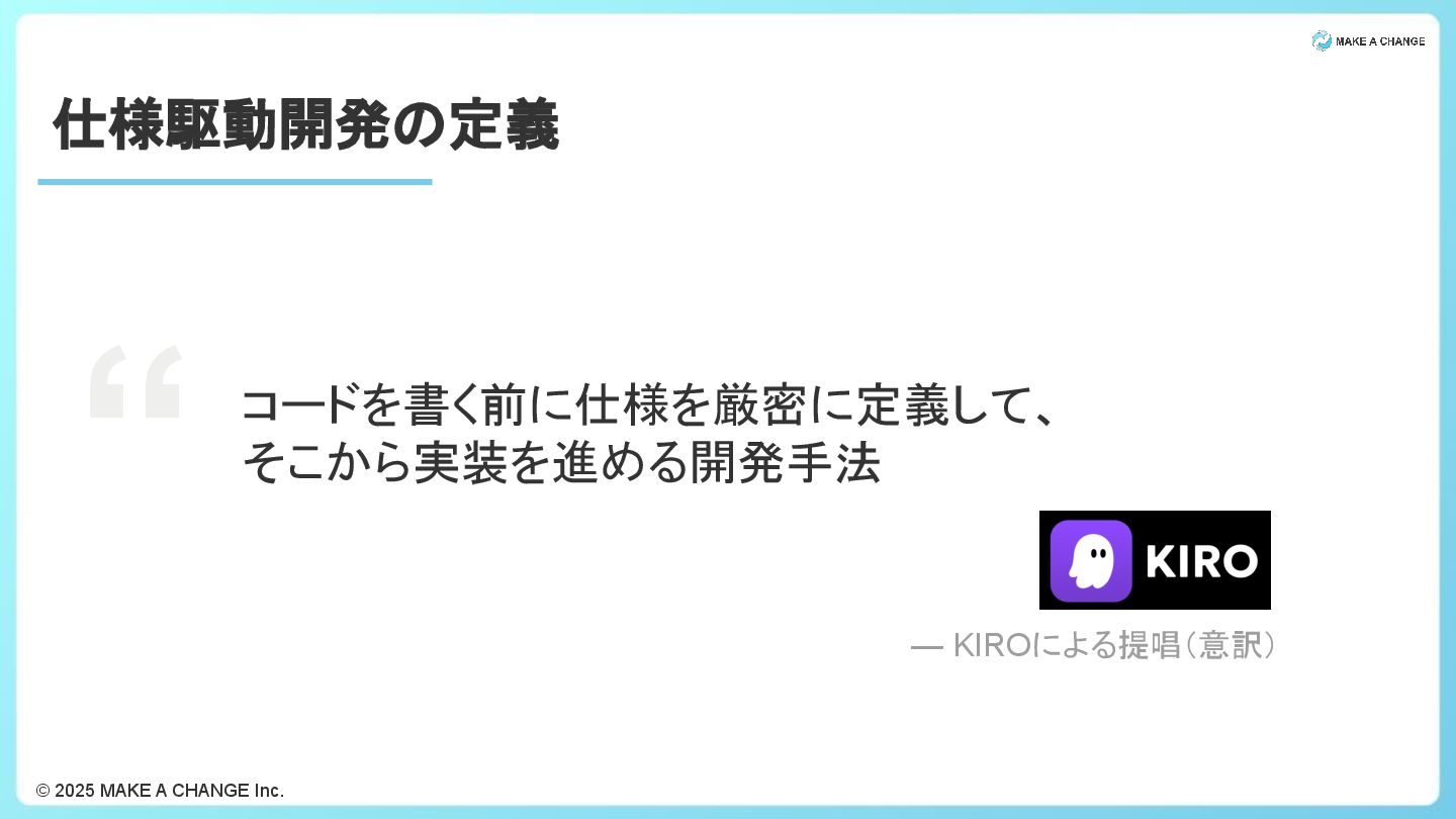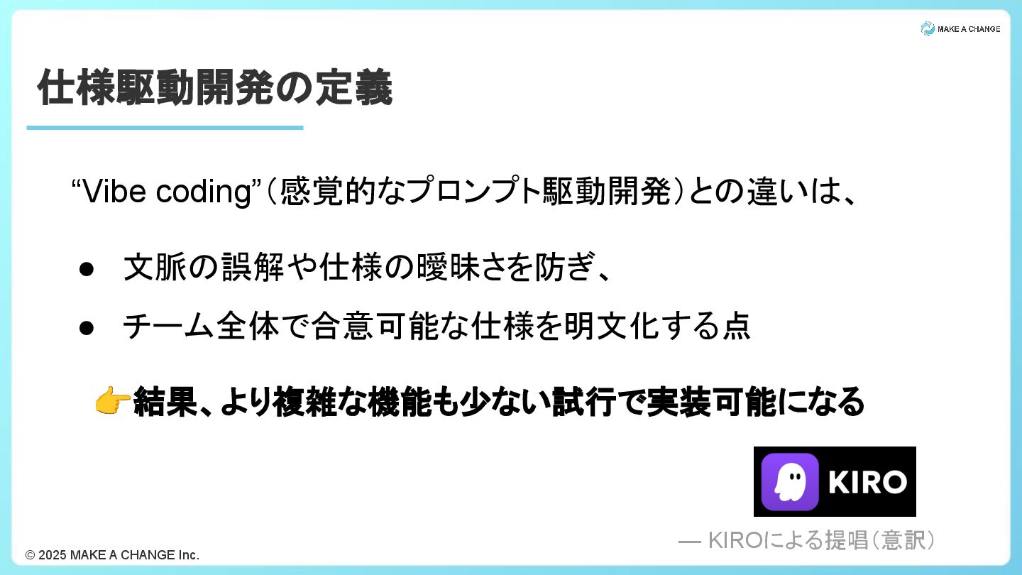 仕様駆動開発の定義 — KIROによる提唱(意訳) © 2025 MAKE A CHANGE Inc. “Vibe