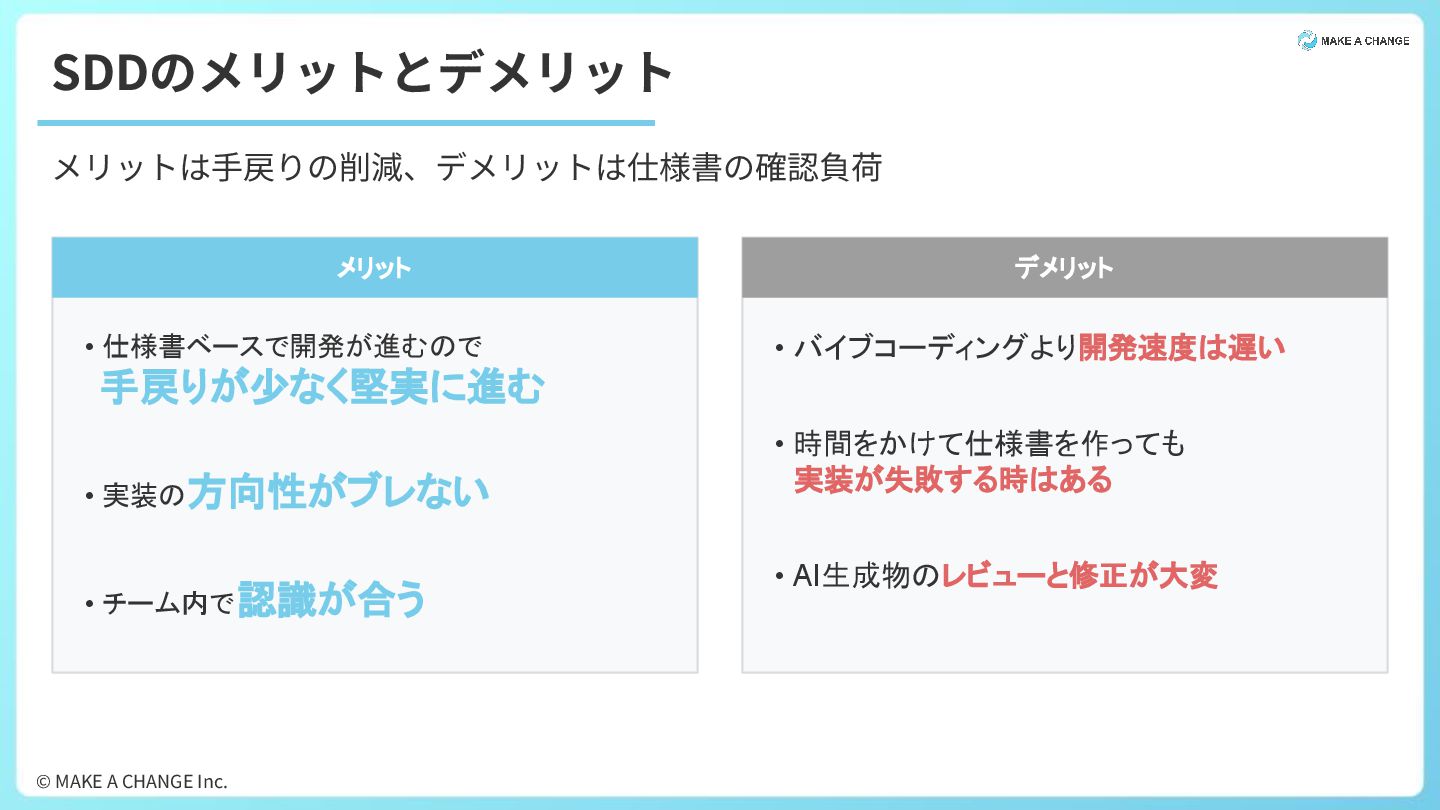 SDDのメリットとデメリット メリットは⼿戻りの削減、デメリットは仕様書の確認負荷 © MAKE A CHANGE Inc. メリット • 仕様書ベースで開発が進むので