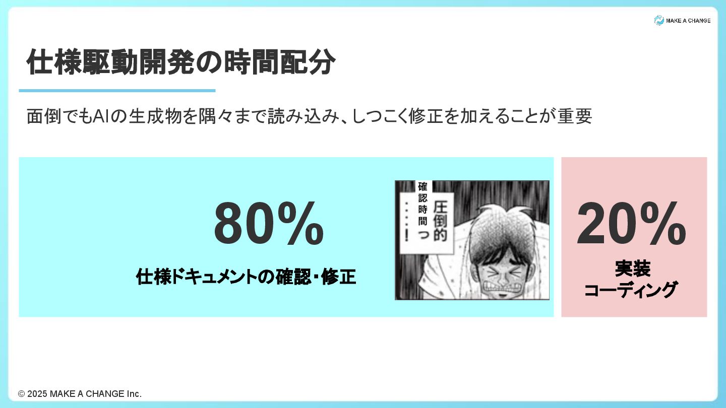 仕様駆動開発の時間配分 面倒でもAIの生成物を隅々まで読み込み、しつこく修正を加えることが重要 仕様ドキュメントの確認・修正 80% 実装 コーディング 20% © 2025 MAKE