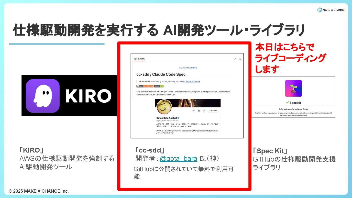 仕様駆動開発を実行する AI開発ツール・ライブラリ © 2025 MAKE A CHANGE Inc. 「cc-sdd」 開発者:@gota_bara