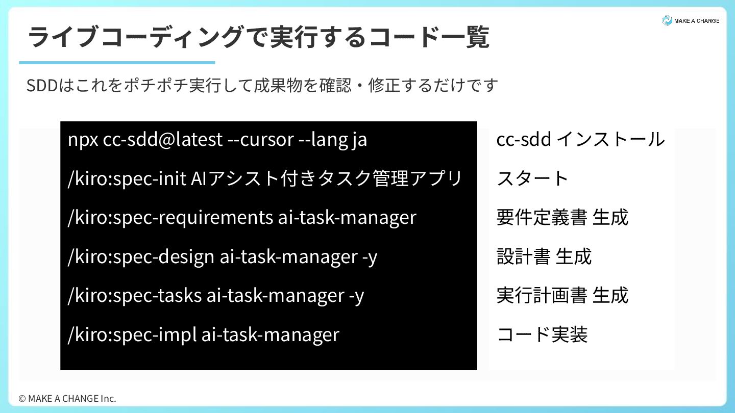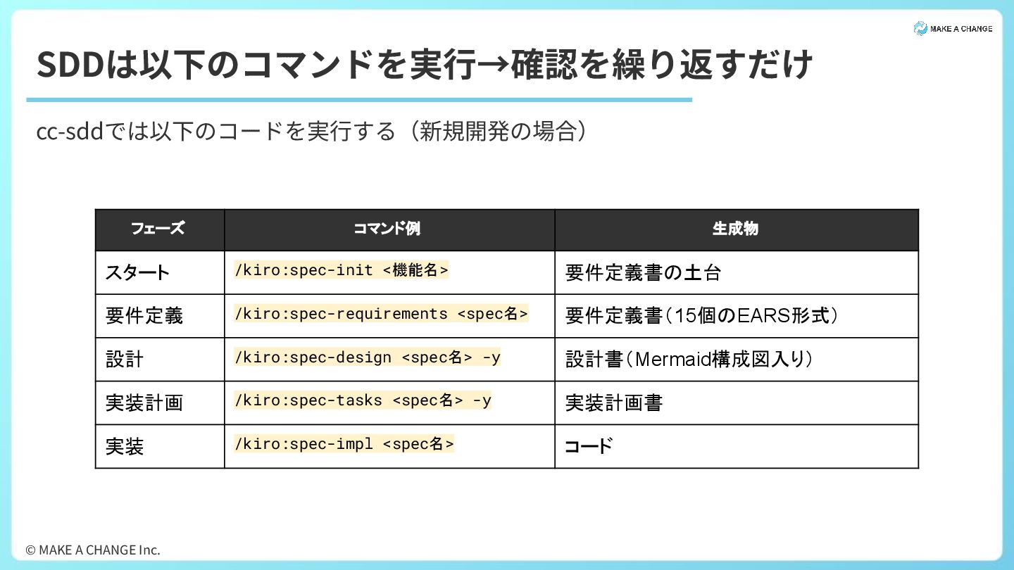 SDDは以下のコマンドを実⾏→確認を繰り返すだけ cc-sddでは以下のコードを実⾏する(新規開発の場合) © MAKE A CHANGE Inc. フェーズ コマンド例 生成物