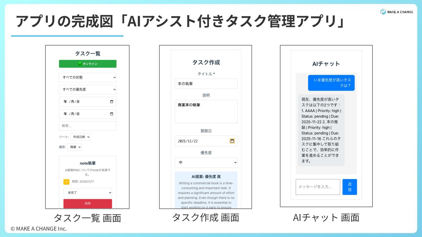 © MAKE A CHANGE Inc. アプリの完成図「AIアシスト付きタスク管理アプリ」 タスク⼀覧 画⾯ タスク作成 画⾯