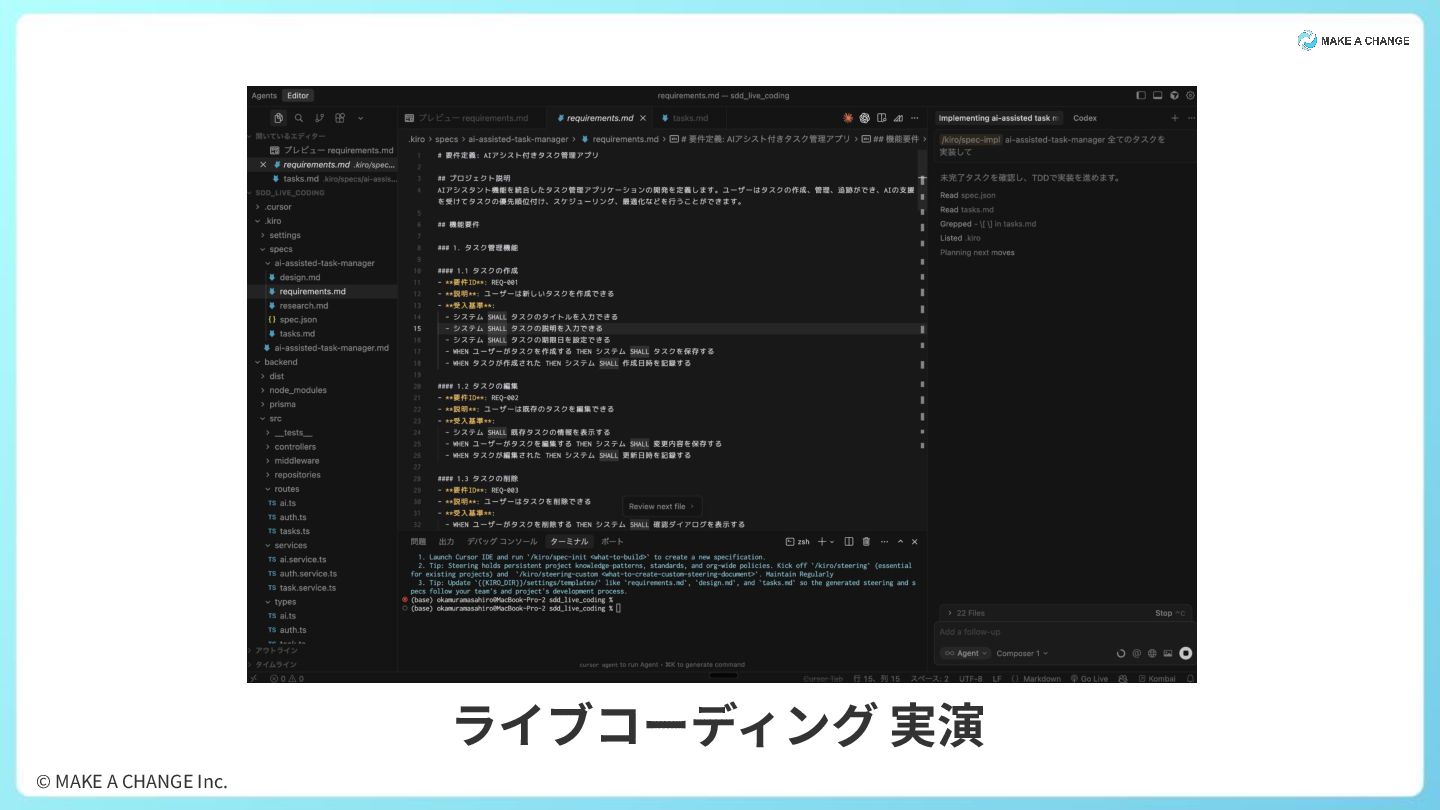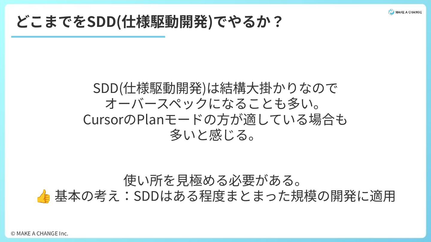 どこまでをSDD(仕様駆動開発)でやるか? SDD(仕様駆動開発)は結構⼤掛かりなので オーバースペックになることも多い。 CursorのPlanモードの⽅が適している場合も 多いと感じる。 © MAKE A CHANGE Inc.