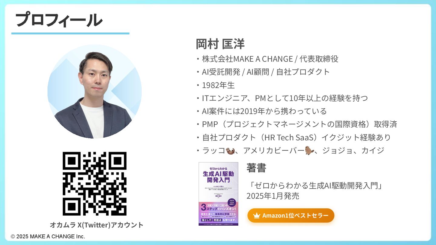 / ⾃社プロダクト ‧1982年⽣ ‧ITエンジニア、PMとして10年以上の経験を持つ ‧AI案件には2019年から携わっている ‧PMP(プロジェクトマネージメントの国際資格)取得済 ‧⾃社プロダクト(HR Tech SaaS)イクジット経験あり ‧ラッコ🦦、アメリカビーバー🦫、ジョジョ、カイジ 著書 「ゼロからわかる⽣成AI駆動開発⼊⾨」 2025年1⽉発売 オカムラ X(Twitter)アカウント プロフィール © 2025 MAKE A CHANGE Inc.