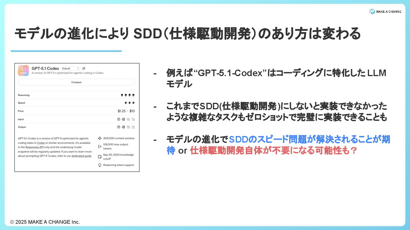 or 仕様駆動開発自体が不要になる可能性も? モデルの進化により SDD(仕様駆動開発)のあり方は変わる © 2025 MAKE A CHANGE Inc.