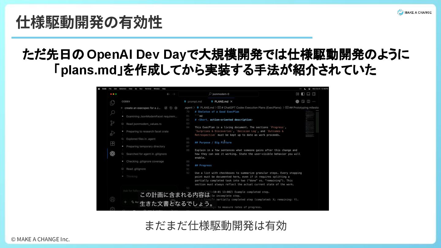 仕様駆動開発の有効性 © MAKE A CHANGE Inc. ただ先日の OpenAI Dev Dayで大規模開発では仕様駆動開発のように
