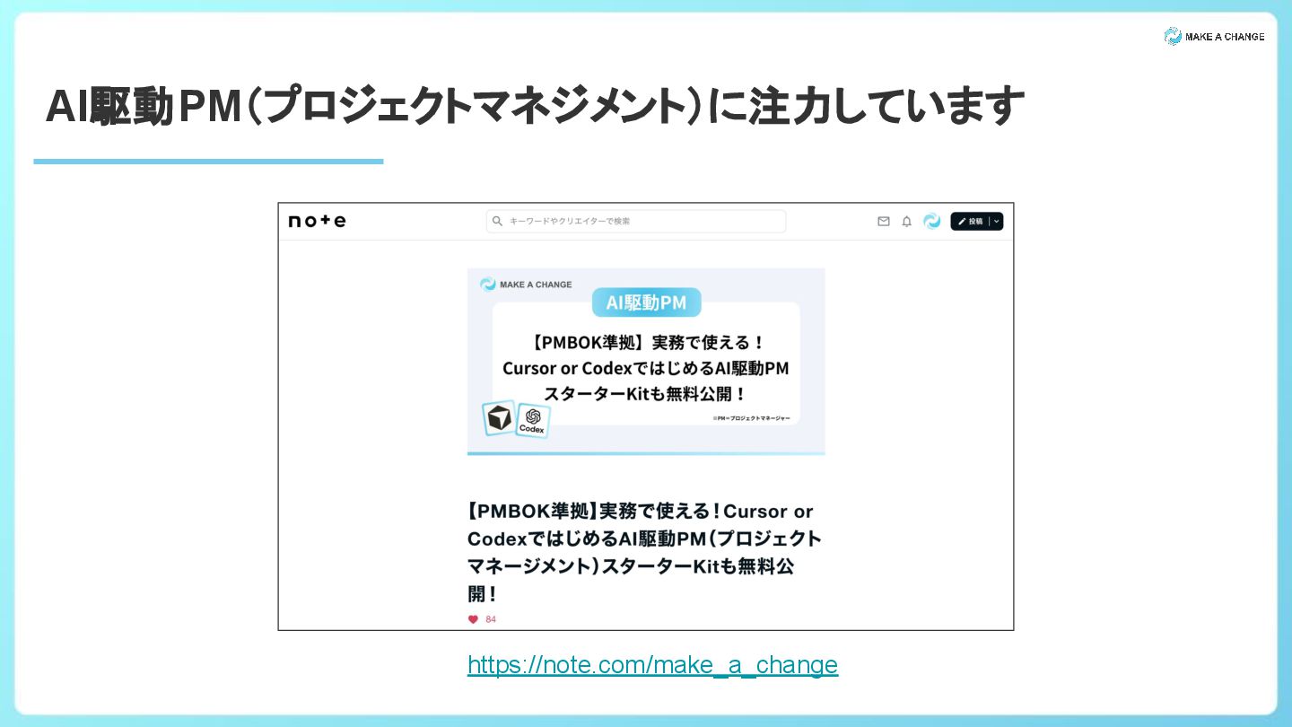 AI駆動PM(プロジェクトマネジメント)に注力しています https://note.com/make_a_change