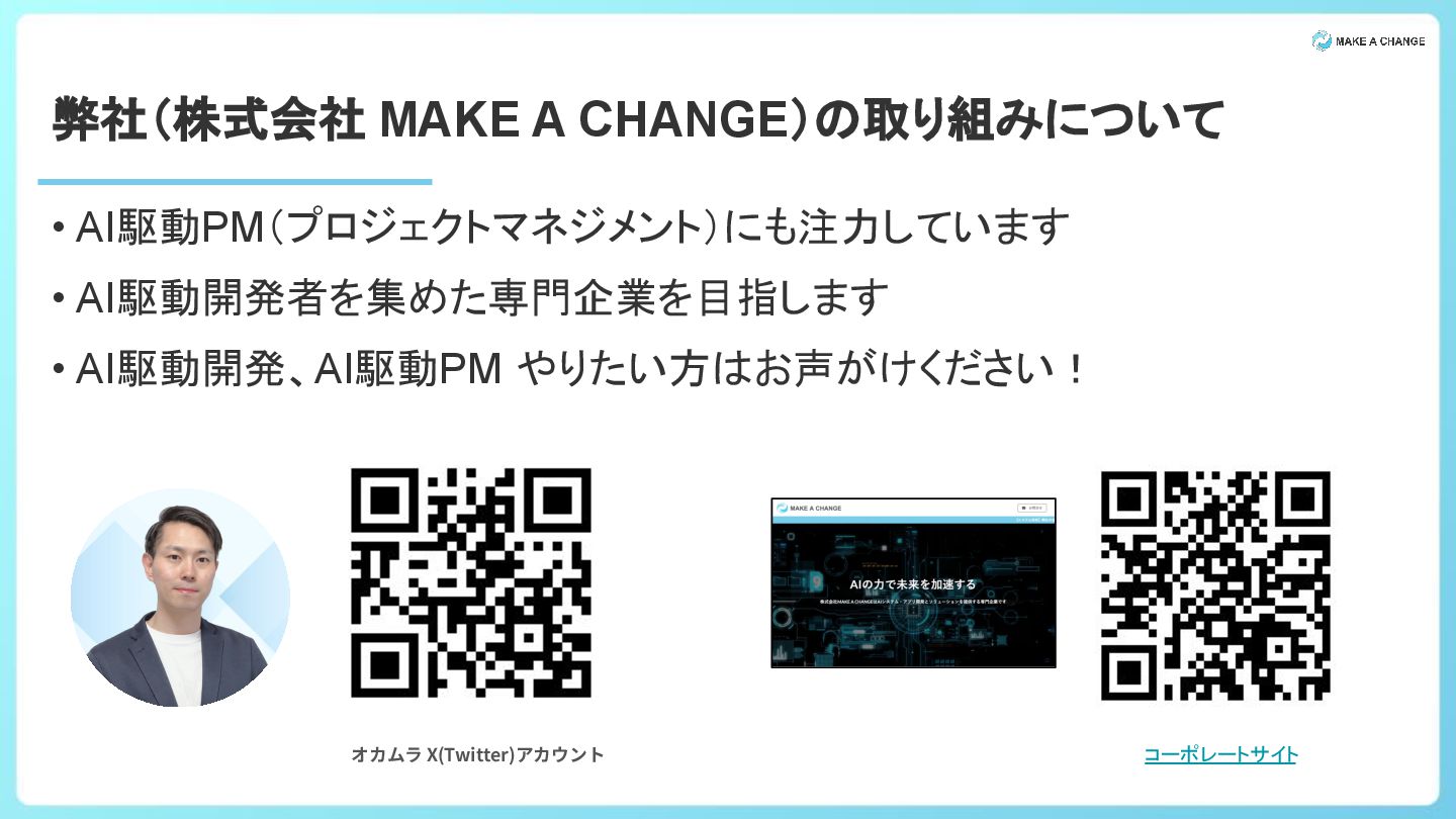 弊社(株式会社 MAKE A CHANGE)の取り組みについて • AI駆動PM(プロジェクトマネジメント)にも注力しています • AI駆動開発者を集めた専門企業を目指します • AI駆動開発、AI駆動PM