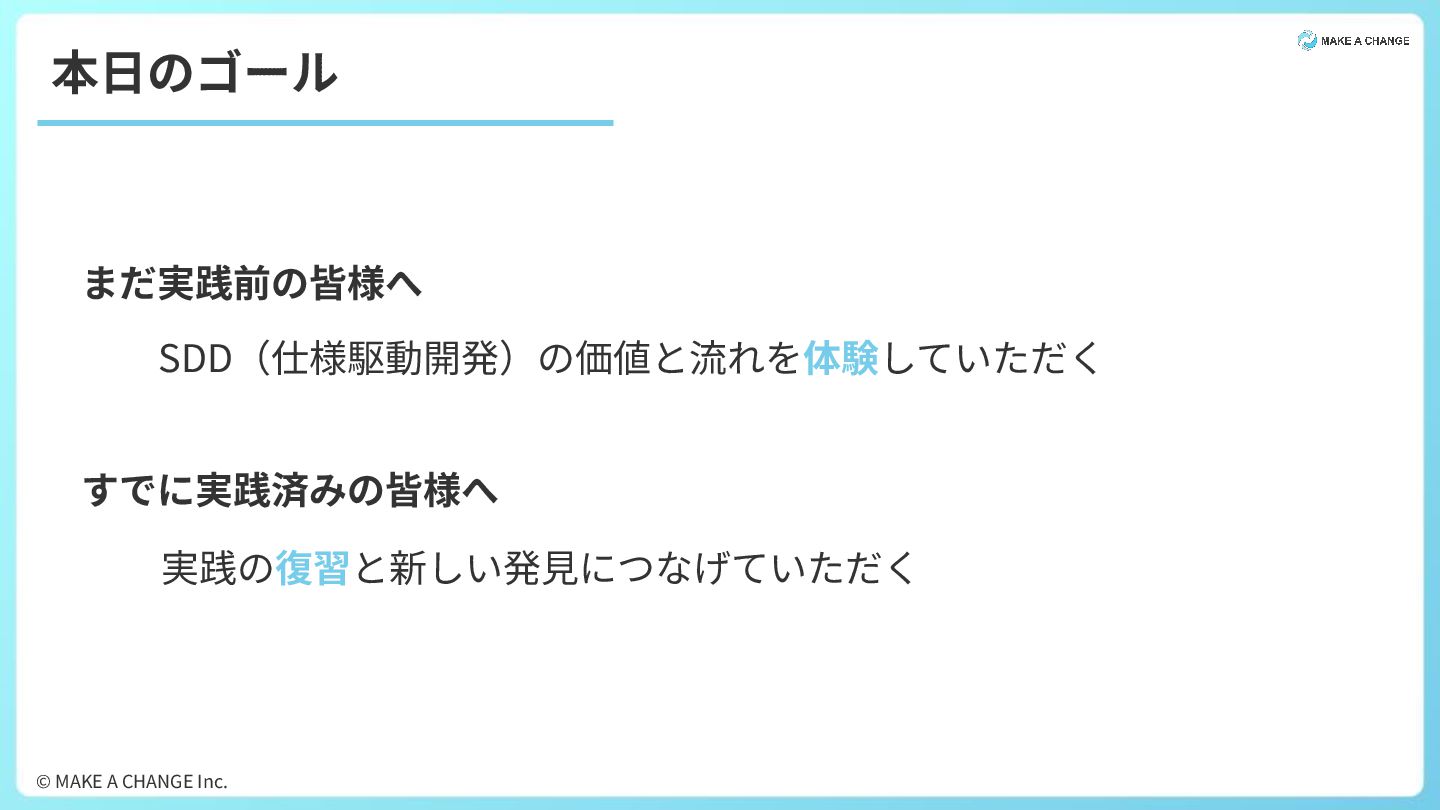 本⽇のゴール まだ実践前の皆様へ SDD(仕様駆動開発)の価値と流れを体験していただく すでに実践済みの皆様へ 実践の復習と新しい発⾒につなげていただく © MAKE A CHANGE Inc.
