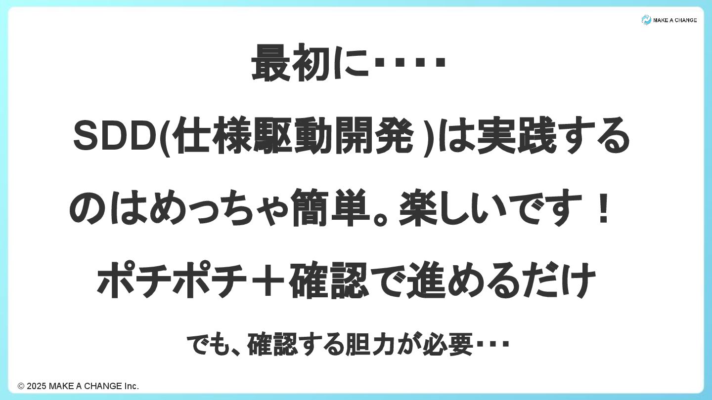 最初に・・・・ SDD(仕様駆動開発 )は実践する のはめっちゃ簡単。楽しいです! ポチポチ+確認で進めるだけ でも、確認する胆力が必要・・・ © 2025 MAKE A