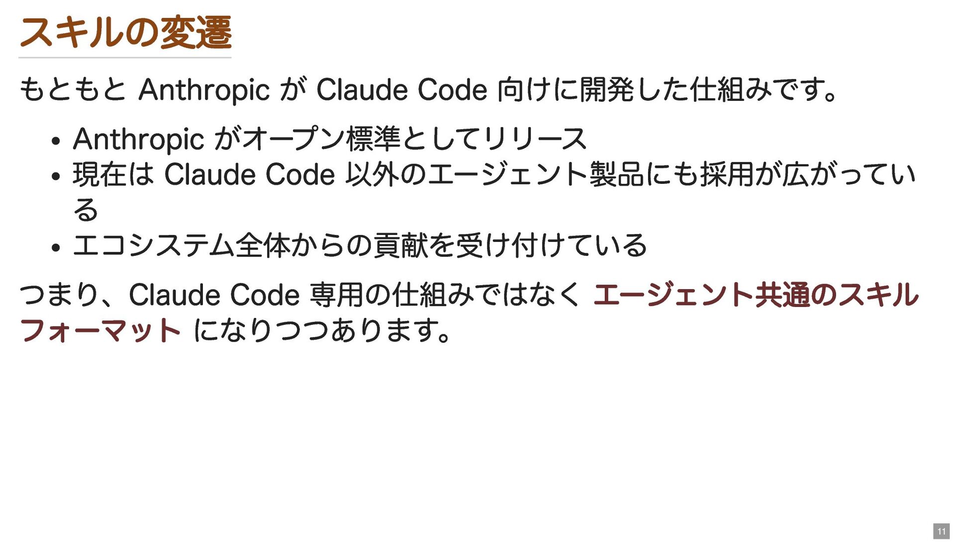スキルの変遷 もともと Anthropic が Claude Code 向けに開発した仕組みです。 Anthropic がオープン標準としてリリース 現在は