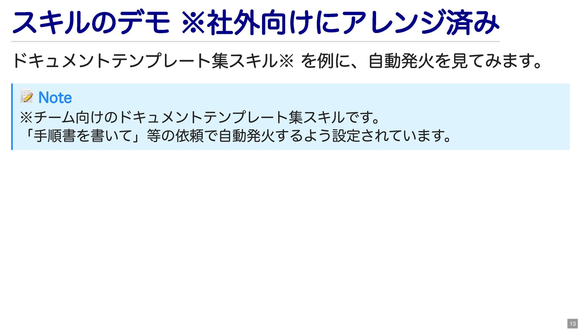 スキルのデモ ※社外向けにアレンジ済み ドキュメントテンプレート集スキル※ を例に、自動発火を見てみます。 📝 Note ※チーム向けのドキュメントテンプレート集スキルです。 「手順書を書いて」等の依頼で自動発火するよう設定されています。 13