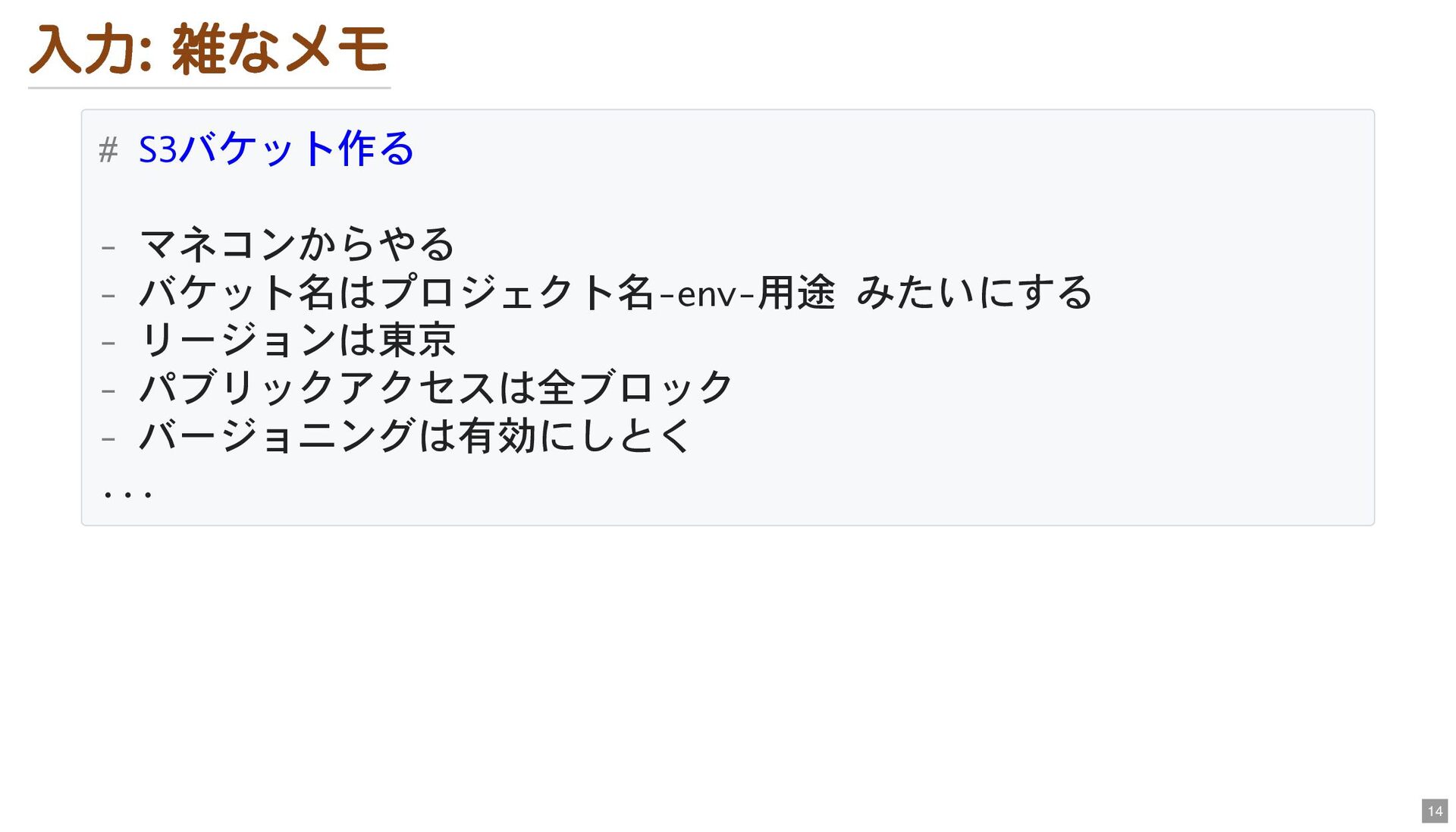 入力: 雑なメモ # S3バケット作る - マネコンからやる - バケット名はプロジェクト名-env-用途 みたいにする -