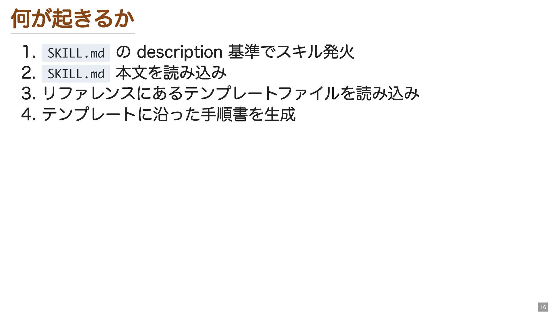 何が起きるか 1. SKILL.md の description 基準でスキル発火 2. SKILL.md 本文を読み込み 3.