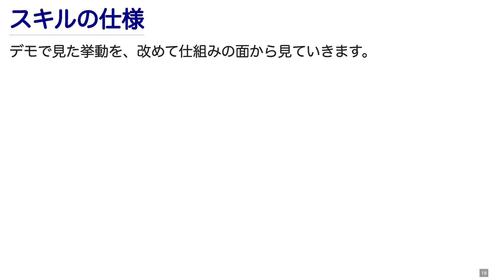 スキルの仕様 デモで見た挙動を、改めて仕組みの面から見ていきます。 18