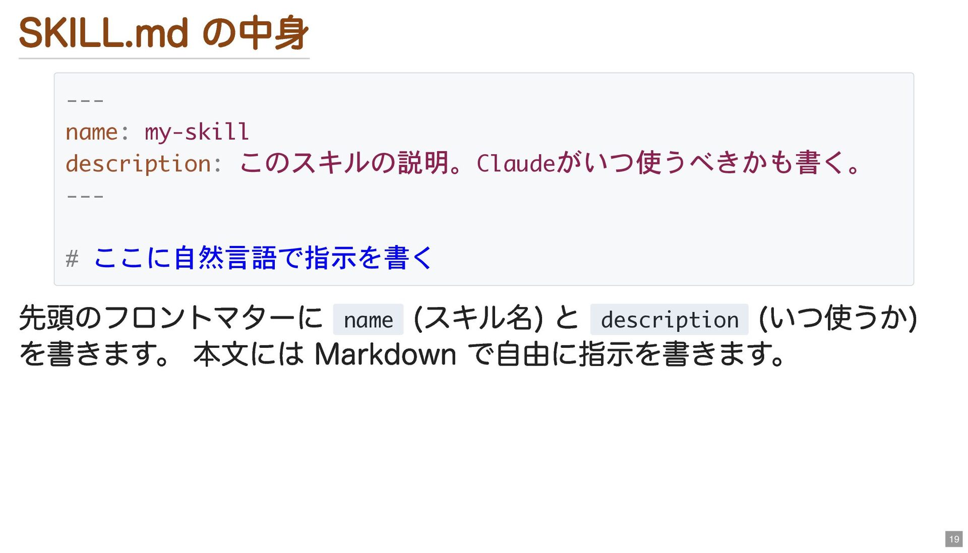 Markdown で自由に指示を書きます。 --- name: my-skill description: このスキルの説明。Claudeがいつ使うべきかも書く。 --- # ここに自然言語で指示を書く 19