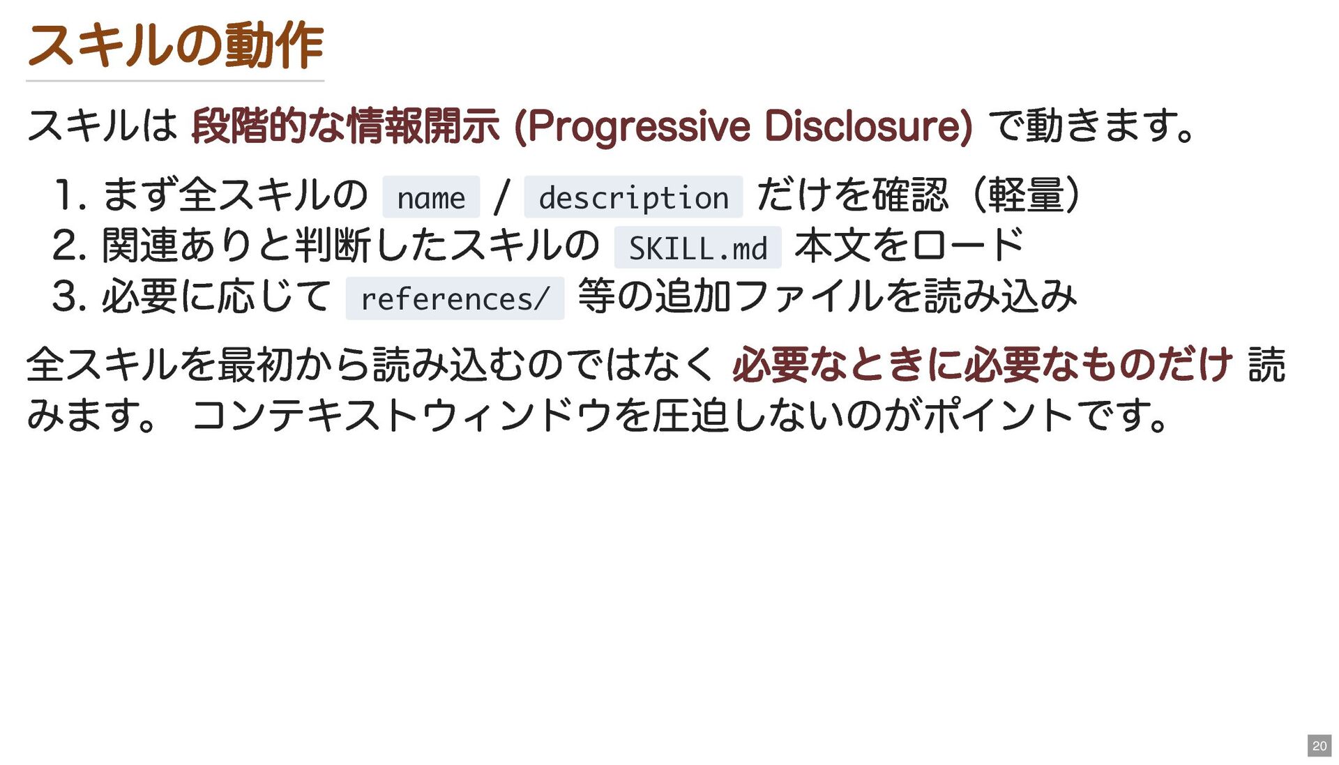 description だけを確認(軽量) 2. 関連ありと判断したスキルの SKILL.md 本文をロード 3. 必要に応じて references/ 等の追加ファイルを読み込み 全スキルを最初から読み込むのではなく 必要なときに必要なものだけ 読 みます。 コンテキストウィンドウを圧迫しないのがポイントです。 20