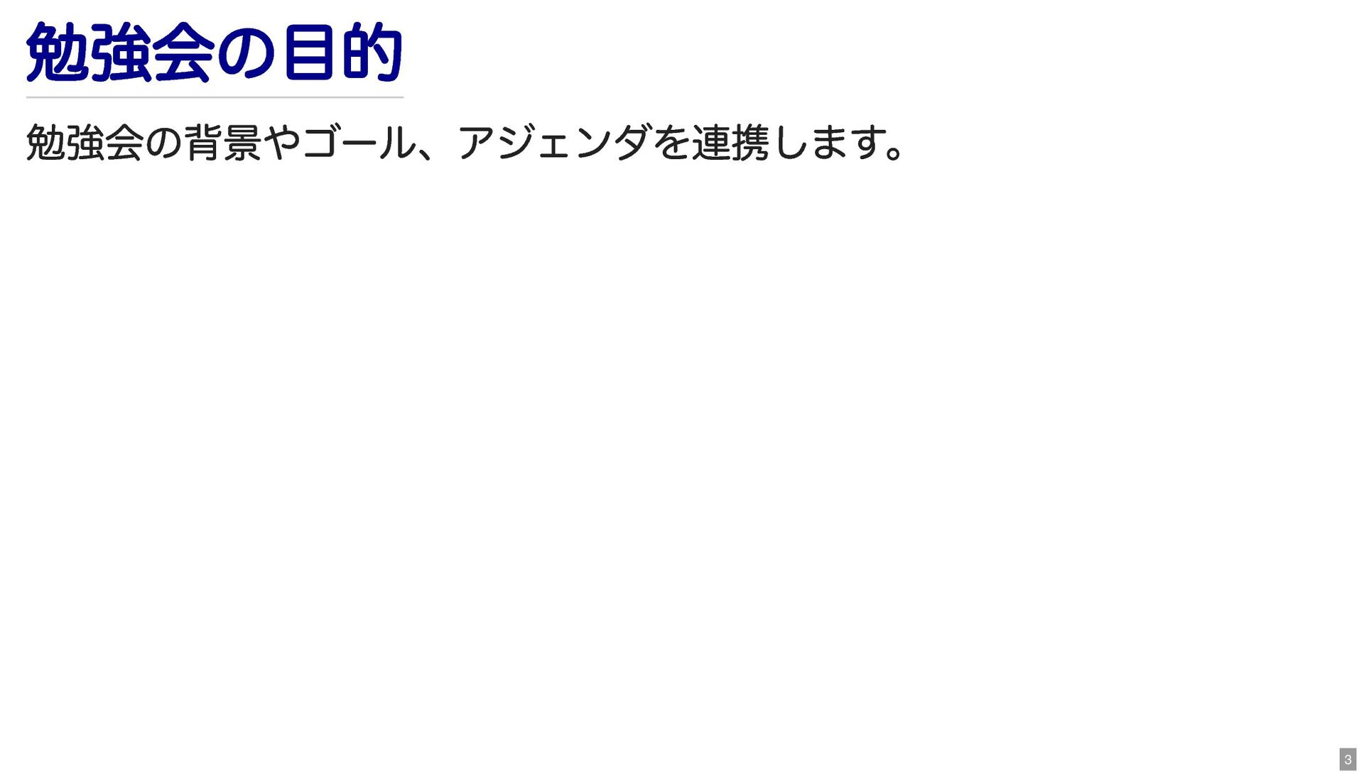 勉強会の目的 勉強会の背景やゴール、アジェンダを連携します。 3