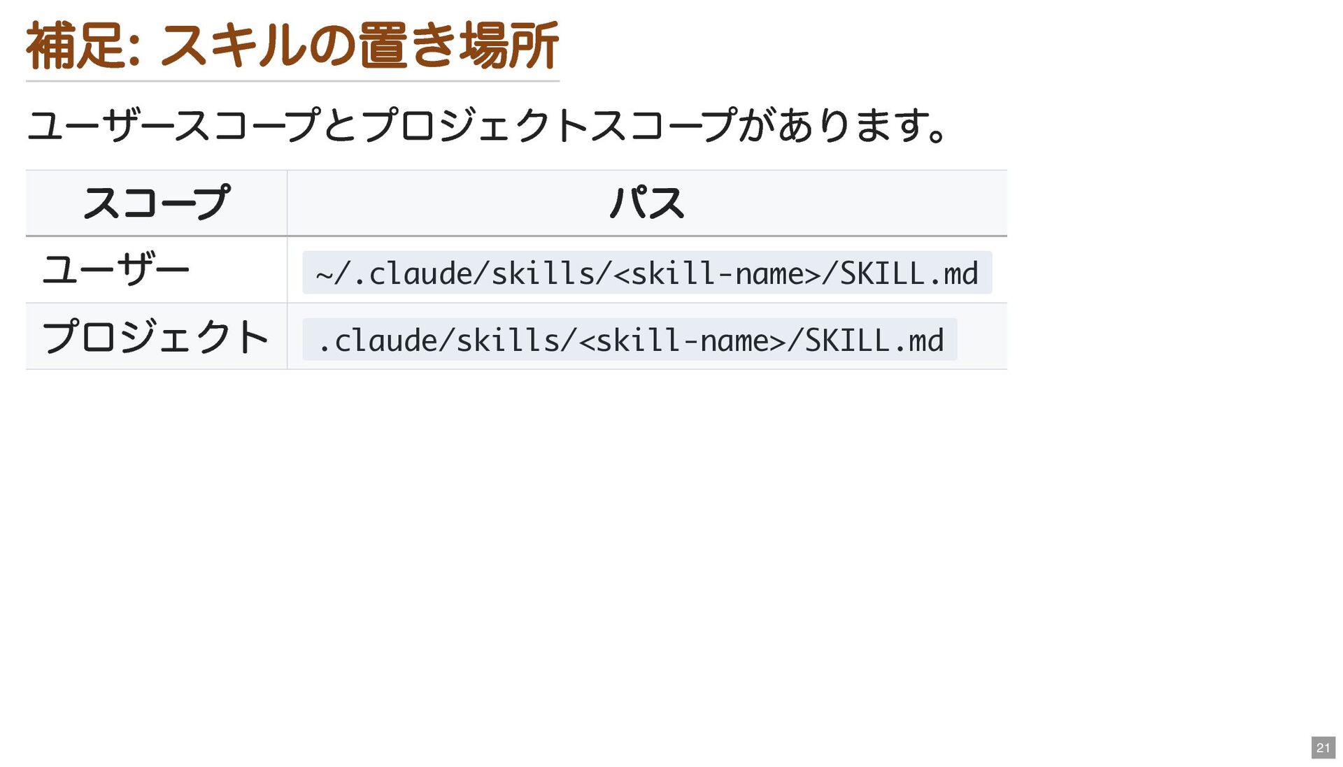 補足: スキルの置き場所 ユーザースコープとプロジェクトスコープがあります。 スコープ パス ユーザー ~/.claude/skills/<skill-name>/SKILL.md プロジェクト .claude/skills/<skill-name>/SKILL.md 21