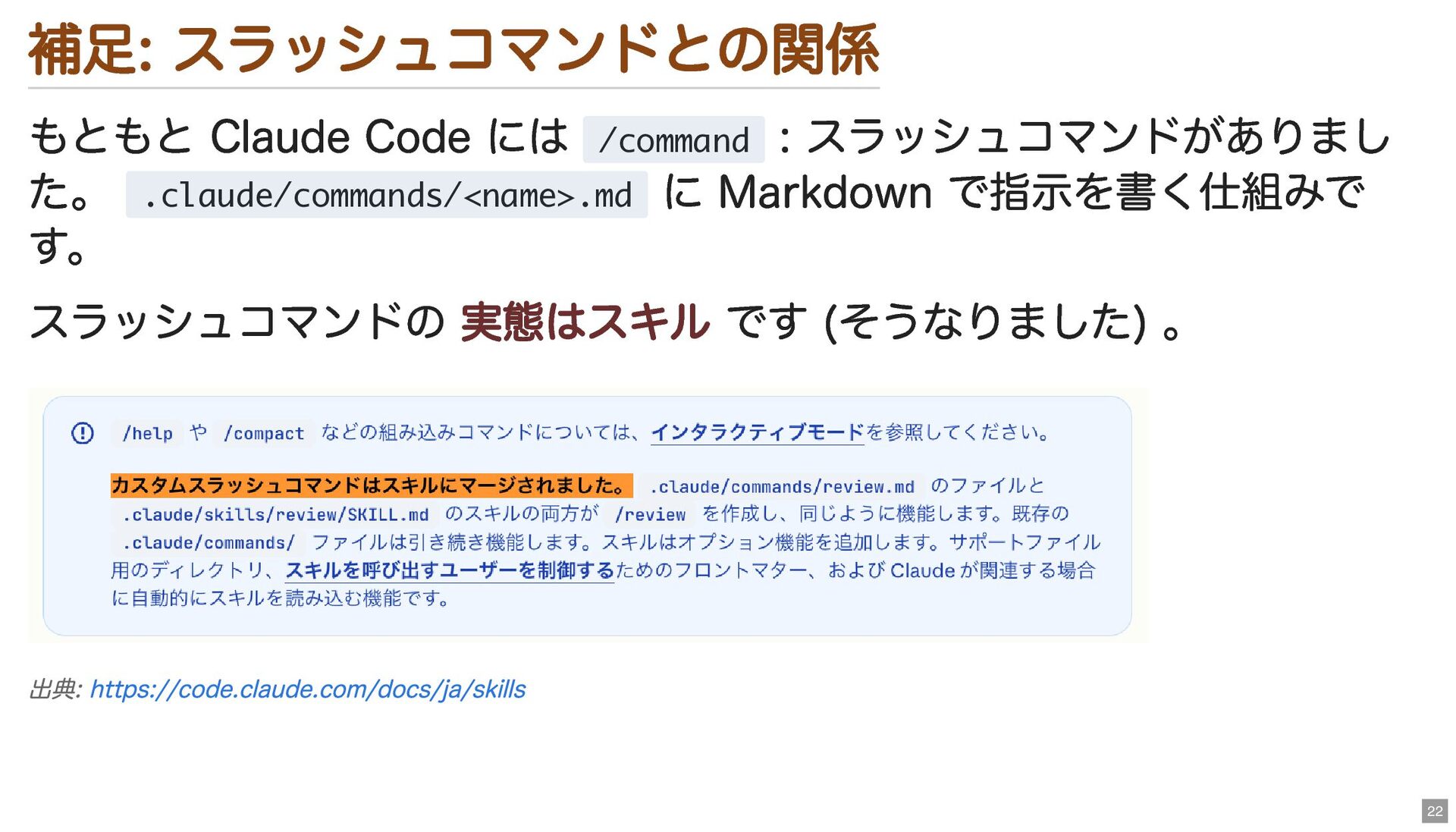 .claude/commands/<name>.md に Markdown で指示を書く仕組みで す。 スラッシュコマンドの 実態はスキル です (そうなりました) 。 出典: https://code.claude.com/docs/ja/skills 22