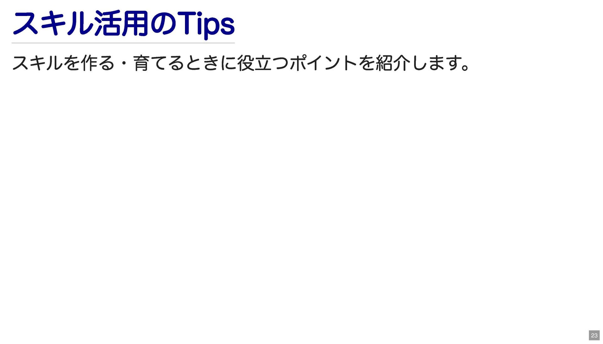 スキル活用のTips スキルを作る・育てるときに役立つポイントを紹介します。 23