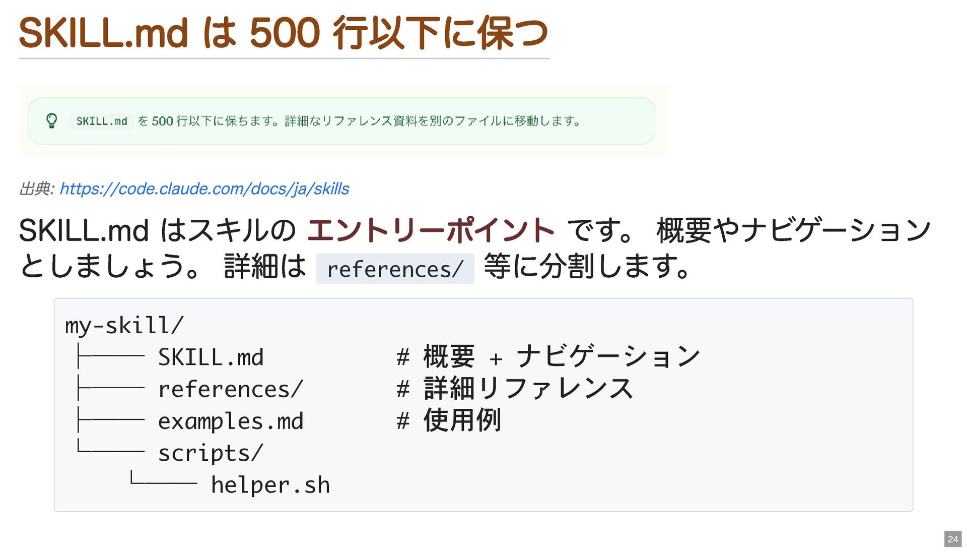 としましょう。 詳細は references/ 等に分割します。 https://code.claude.com/docs/ja/skills my-skill/ ├── SKILL.md # 概要 + ナビゲーション ├── references/ # 詳細リファレンス ├── examples.md # 使用例 └── scripts/ └── helper.sh 24