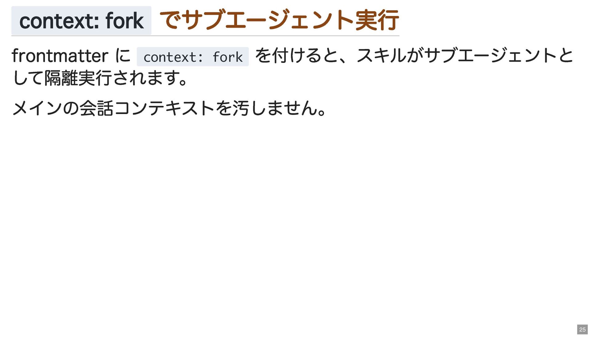 context: fork でサブエージェント実行 frontmatter に context: fork を付けると、スキルがサブエージェントと して隔離実行されます。 メインの会話コンテキストを汚しません。